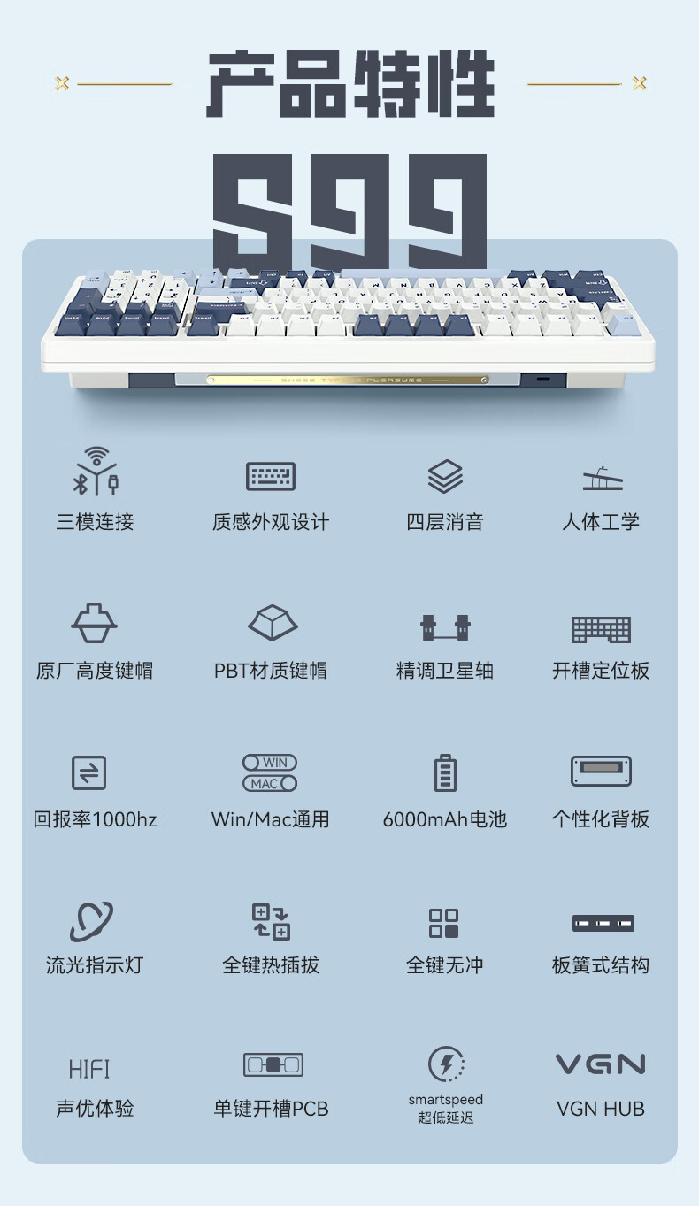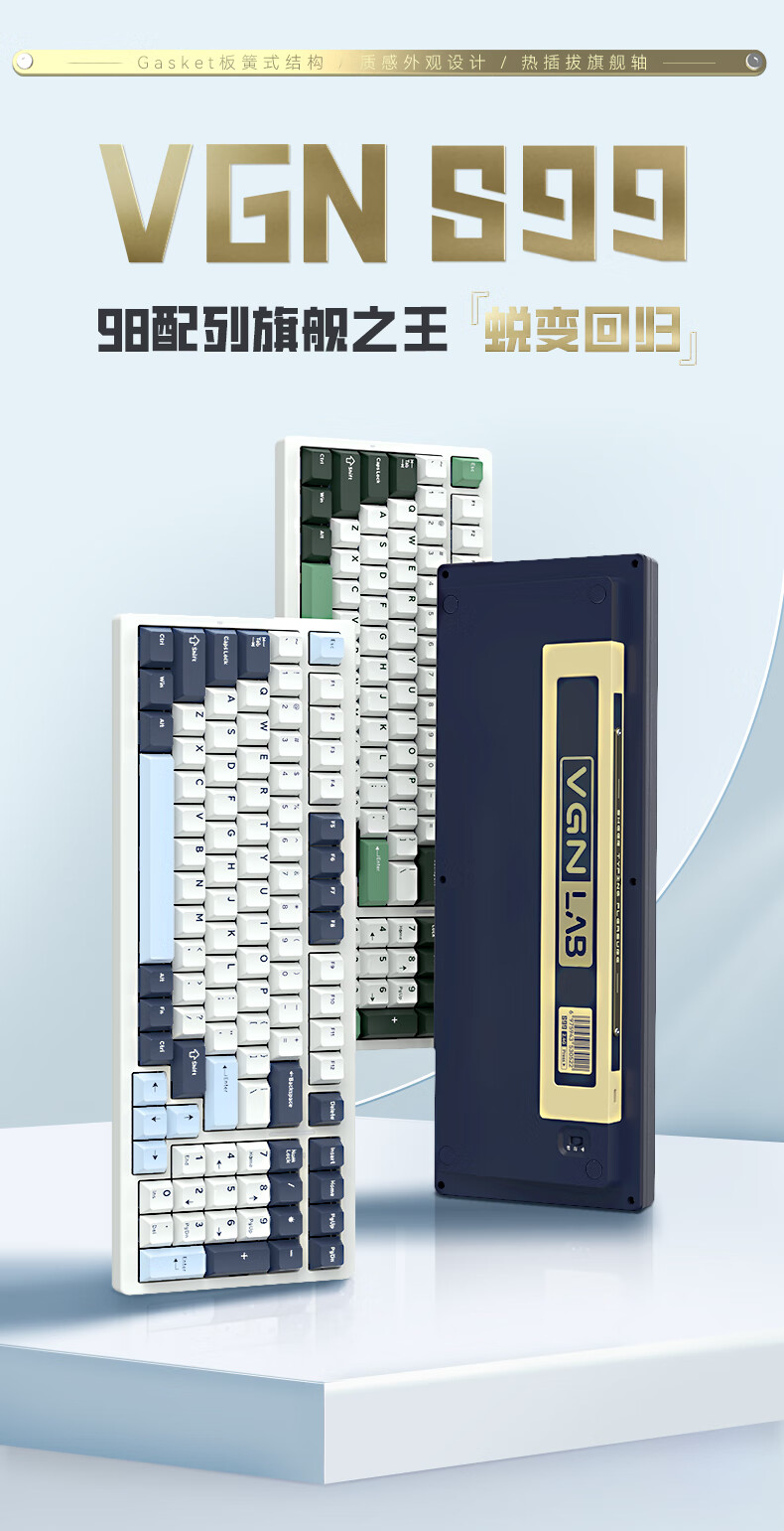 商品名称:VGN S99 三模连接 蓝牙/无线 客制化键盘 机械键盘 游戏电竞 办公 单键开槽 全键热插拔 gasket结构 S99 阿尼亚轴 斑斓绿