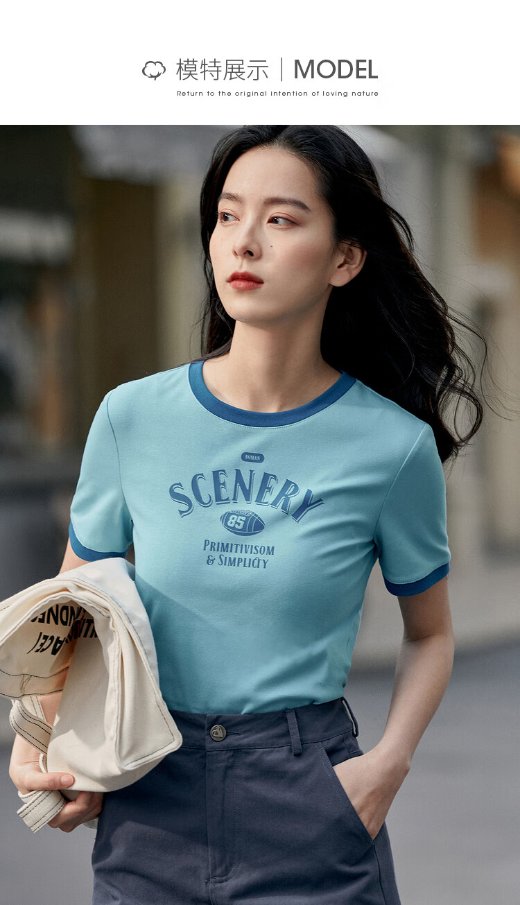 商品名称:茵曼印花圆领T恤女夏季新款套头潮趣修身显瘦短款短袖上衣 月牙白 M